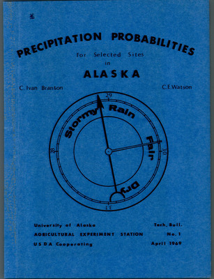This publication is the result of cooperation between many research entities whose separate contributions have made it possible to assemble this information concerning precipitation in the nation's largest state, Alaska. The program to extract precipitation probabilities from the raw data was developed by Drs. L. D. Bark and A. M. Feyerherm of Kansas State University of Agriculture and Applied Science as a contribution to the regional research of the North Central Committee NC-26 concerned with "Weather Information for Agriculture". The program was modified and adapted to a higher speed computer by Dr. G. L. Ashcroft of the Utah State University of Agriculture and Applied Science as a contribution of the Western regional Committee W-48, concerned with "Weather and its Relation to Agriculture. The final processing of Alaskan data was made possible by the close cooperation of the Western Data Processing Center of the University of California at Los Angeles and the personnel of the computer center of the University of Alaska at College.