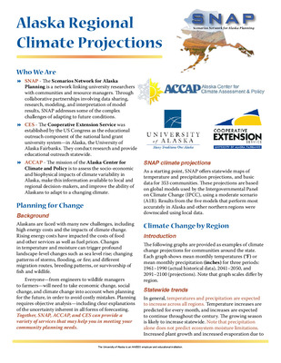 SNAP is a collaborative network that includes the University of Alaska, state, federal, and local agencies, NGO’s, and industry partners. The SNAP network provides timely access to scenarios of future conditions in Alaska for more effective planning by communities, industry, and land managers. We meet stakeholders’ requests for specific information by applying new or existing research results, integrating and analyzing data, and communicating information and assumptions to stakeholders. Our goal is to assist in informed decision-making.