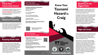 Coastal Alaska communities live with the most serious tsunami hazard in the United States. The Alaska Earthquake Center helps coastal communities prepare for the next tsunami disaster. We provide state and local officials with the best available scientific information for addressing the variety of tsunami hazards faced by their communities. These community-specific brochures distill information from several scientific publications, such as tsunami inundation reports, pedestrian travel time maps, and maritime response guidance, into a handy, quick reference. The brochures include maps with community-designated safety information, historical tsunami information, as well as links for local and statewide tsunami preparedness information. The brochures are rack-card size for easy display, and a great safety resource for both locals and visitors. The Earthquake Center partnered with the Alaska Division of Homeland Security and Emergency Management and the City of Craig to create this brochure, tailoring the map, safety contact information, and historical information to this location.