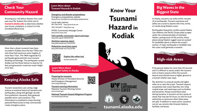Coastal Alaska communities live with the most serious tsunami hazard in the United States. The Alaska Earthquake Center helps coastal communities prepare for the next tsunami disaster. We provide state and local officials with the best available scientific information for addressing the variety of tsunami hazards faced by their communities. These community-specific brochures distill information from several scientific publications, such as tsunami inundation reports, pedestrian travel time maps, and maritime response guidance, into a handy, quick reference. The brochures include maps with community-designated safety information, historical tsunami information, as well as links for local and statewide tsunami preparedness information. The brochures are rack-card size for easy display, and a great safety resource for both locals and visitors. The Earthquake Center partnered with the Alaska Division of Homeland Security and Emergency Management and the City of Kodiak to create this brochure, tailoring the map, safety contact information, and historical information to this location.