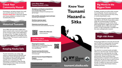 Coastal Alaska communities live with the most serious tsunami hazard in the United States. The Alaska Earthquake Center helps coastal communities prepare for the next tsunami disaster. We provide state and local officials with the best available scientific information for addressing the variety of tsunami hazards faced by their communities. These community-specific brochures distill information from several scientific publications, such as tsunami inundation reports, pedestrian travel time maps, and maritime response guidance, into a handy, quick reference. The brochures include maps with community-designated safety information, historical tsunami information, as well as links for local and statewide tsunami preparedness information. The brochures are rack-card size for easy display, and a great safety resource for both locals and visitors. The Earthquake Center partnered with the Alaska Division of Homeland Security and Emergency Management and the City of Sitka to create this brochure, tailoring the map, safety contact information, and historical information to this location.