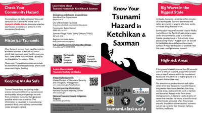 Coastal Alaska communities live with the most serious tsunami hazard in the United States. The Alaska Earthquake Center helps coastal communities prepare for the next tsunami disaster. We provide state and local officials with the best available scientific information for addressing the variety of tsunami hazards faced by their communities. These community-specific brochures distill information from several scientific publications, such as tsunami inundation reports, pedestrian travel time maps, and maritime response guidance, into a handy, quick reference. The brochures include maps with community-designated safety information, historical tsunami information, as well as links for local and statewide tsunami preparedness information. The brochures are rack-card size for easy display, and a great safety resource for both locals and visitors. The Earthquake Center partnered with the Alaska Division of Homeland Security and Emergency Management, the City of Ketchikan, and the City of Saxman to create this brochure, tailoring the map, safety contact information, and historical information to this location.