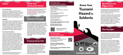 Coastal Alaska communities live with the most serious tsunami hazard in the United States. The Alaska Earthquake Center helps coastal communities prepare for the next tsunami disaster. We provide state and local officials with the best available scientific information for addressing the variety of tsunami hazards faced by their communities. These community-specific brochures distill information from several scientific publications, such as tsunami inundation reports, pedestrian travel time maps, and maritime response guidance, into a handy, quick reference. The brochures include maps with community-designated safety information, historical tsunami information, as well as links for local and statewide tsunami preparedness information. The brochures are rack-card size for easy display, and a great safety resource for both locals and visitors. The Earthquake Center partnered with the Alaska Division of Homeland Security and Emergency Management and the City of Seward to create this brochure, tailoring the map, safety contact information, and historical information to this location.