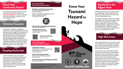 Coastal Alaska communities live with the most serious tsunami hazard in the United States. The Alaska Earthquake Center helps coastal communities prepare for the next tsunami disaster. We provide state and local officials with the best available scientific information for addressing the variety of tsunami hazards faced by their communities. These community-specific brochures distill information from several scientific publications, such as tsunami inundation reports, pedestrian travel time maps, and maritime response guidance, into a handy, quick reference. The brochures include maps with community-designated safety information, historical tsunami information, as well as links for local and statewide tsunami preparedness information. The brochures are rack-card size for easy display, and a great safety resource for both locals and visitors. The Earthquake Center partnered with the Alaska Division of Homeland Security and Emergency Management and the City of Hope to create this brochure, tailoring the map, safety contact information, and historical information to this location.