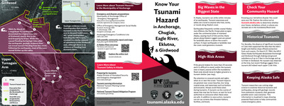 Coastal Alaska communities live with the most serious tsunami hazard in the United States. The Alaska Earthquake Center helps coastal communities prepare for the next tsunami disaster. We provide state and local officials with the best available scientific information for addressing the variety of tsunami hazards faced by their communities. These community-specific brochures distill information from several scientific publications, such as tsunami inundation reports, pedestrian travel time maps, and maritime response guidance, into a handy, quick reference. The brochures include maps with community-designated safety information, historical tsunami information, as well as links for local and statewide tsunami preparedness information. The brochures are rack-card size for easy display, and a great safety resource for both locals and visitors. The Earthquake Center partnered with the Alaska Division of Homeland Security and Emergency Management and the Municipality of Anchorage to create this brochure, tailoring the map, safety contact information, and historical information to this location.