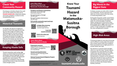 Coastal Alaska communities live with the most serious tsunami hazard in the United States. The Alaska Earthquake Center helps coastal communities prepare for the next tsunami disaster. We provide state and local officials with the best available scientific information for addressing the variety of tsunami hazards faced by their communities. These community-specific brochures distill information from several scientific publications, such as tsunami inundation reports, pedestrian travel time maps, and maritime response guidance, into a handy, quick reference. The brochures include maps with community-designated safety information, historical tsunami information, as well as links for local and statewide tsunami preparedness information. The brochures are rack-card size for easy display, and a great safety resource for both locals and visitors. The Earthquake Center partnered with the Alaska Division of Homeland Security and Emergency Management and the Matanuska-Susitna Borough to create this brochure, tailoring the map, safety contact information, and historical information to this location.