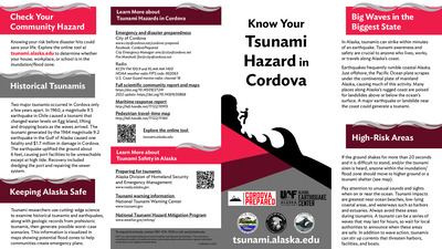 Coastal Alaska communities live with the most serious tsunami hazard in the United States. The Alaska Earthquake Center helps coastal communities prepare for the next tsunami disaster. We provide state and local officials with the best available scientific information for addressing the variety of tsunami hazards faced by their communities. These community-specific brochures distill information from several scientific publications, such as tsunami inundation reports, pedestrian travel time maps, and maritime response guidance, into a handy, quick reference. The brochures include maps with community-designated safety information, links for local and statewide tsunami preparedness information, and more. The brochures are rack-card size for easy display, and a great safety resource for both locals and visitors. The Earthquake Center partnered with the Alaska Division of Homeland Security and Emergency Management and the City of Cordova to create this brochure, tailoring the map, safety contact information, and other information to this location.