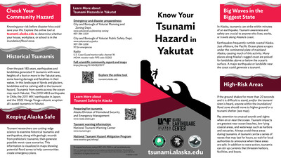 Coastal Alaska communities live with the most serious tsunami hazard in the United States. The Alaska Earthquake Center helps coastal communities prepare for the next tsunami disaster. We provide state and local officials with the best available scientific information for addressing the variety of tsunami hazards faced by their communities. These community-specific brochures distill information from several scientific publications, such as tsunami inundation reports, pedestrian travel time maps, and maritime response guidance, into a handy, quick reference. The brochures include maps with community-designated safety information, historical tsunami information, as well as links for local and statewide tsunami preparedness information. The brochures are rack-card size for easy display, and a great safety resource for both locals and visitors. The Earthquake Center partnered with the Alaska Division of Homeland Security and Emergency Management and the City and Borough of Yakutat to create this brochure, tailoring the map, safety contact information, and historical information to this location.