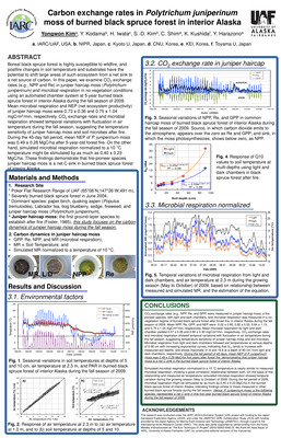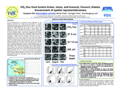 We deployed the FD chamber system in a tundra ecosystem over the discontinuous permafrost regime of Council, Alaska. The representative understory plants are tussock (17 %), lichen (32 %), and moss (51 %), within a 40 × 40 m plot at an interval of five meters (81 points total) for efflux-measurement by dynamic chamber. The FD chamber monitored soil CO2 effluxes from moss, lichen, and tussock regimes at an interval of 30 min during the growing season of 2015. As the results, mean soil CO2 effluxes in intact and infected sphagnum moss, lichen, and tussock were 0.42 ± 0.17, 0.39 ± 0.22, 0.76 ± 0.21, and 0.87 ± 0.41 μmol/m2/s during June 25 to September 21 2015, respectively. Mean simulated soil CO2 efflux normalized by air temperature of 10°C were 0.40 ± 0.17, 0.36 ± 0.16, 0.77 ± 0.13, and 0.85 ± 0.30 μmol/m2/s from four plants, respectively, suggesting there are not significant differences between measured and simulated CO2 effluxes.