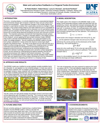 The Arctic, including Alaska, is currently experiencing an unprecedented degree of environmental change with increases in both the mean annual surface temperature and precipitation. These observed changes in the climate regime has resulted in a permafrost condition that is particularly sensitive to changes in both Changes in the surface energy balance and water balances and is susceptible to degradation. Thermokarst topography forms whenever ice-rich permafrost thaws and the ground subsides into the resulting voids. Extensive areas of thermokarst activity are currently being observed throughout the arctic and sub-arctic environments. The important processes involved with thermokarsting include surface ponding, surface subsidence, changes in drainage patterns, and related erosion. In this research, we are applying the land-surface evolution model, ERODE (http://csdms.colorado.edu/wiki/Model:Erode), to an area dominated by low- center, ice-wedge polygons. We are modifying the ERODE model to include land surface subsistence in areas where the maximum active layer depth exceeds the protective layer – the layer of soil above ice-rich soils that acts as a buffer to surface energy processes. The goal of this modeling study is to better understand and quantify the development of thermokarst features in the polygonal tundra environment, emphasizing the resulting feedbacks and connections between hydrologic processes and a dynamic surface topography. Further, we are working on understanding the balance between thermal and mechanical processes with regard to thermokarst processes. This unique application of a landscape evolution model may provide valuable insight related to the rates and spatial extent of thermokarst development and the subsequent hydrologic responses to degrading permafrost in a changing climate.