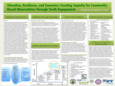 Education and learning possess powerful potential in affecting future resilience and community-based monitoring. This research focuses on examining the connections and feedbacks between social-environmental systems (SESs), resilience, and compulsory education. We suggest scenarios development as a way to link local-scale interest in change to education and monitoring of key variables for resilience. SESs have been problematized as frequently having a poor fit between environmental change and policy solutions. This has led to discussion and debate over the role of schools in addressing local knowledge, environmental changes, and community priorities. In Alaska and other Arctic countries, the role of public schools in improving this fit has been largely overlooked. This research explains that as extensions of governments, public schools offer an opportunity to create better linkages between societies and environments through governance. Secondarily, at the individual level, education is a vital component of resilience, but such education must embrace multiple perspectives in its curriculum in order to honor and access the diversity offered by local, traditional ecological knowledge and Western methods. Scenarios are inherently transdisciplinary processes that integrate different knowledge perspectives as participants consider what matters the most and what is most uncertain in the long-range future. We report research results from two linked scenarios projects. The Northern Alaska Scenarios Project (NASP) drew resident expert participants from the North Slope and Northwest Arctic Boroughs and the Arctic Future Makers project (AFM) that completed a scenarios exercise with high school students from across the Northwest Arctic Borough.