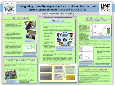 To build the capacity to navigate the challenges associated with a changing climate, learning in Arctic communities must not only increase knowledge, but also generate new knowledge as the rapid changes occur. Citizen science, the process whereby citizens (including K-12 students) are involved in science as researchers, presents a possible mechanism to meet this need. However, hypothesis-driven models of citizen science have been criticized for a disconnect between scientific agendas and the priorities and needs of diverse communities. The new education and research program at the University of Alaska Fairbanks, entitled Arctic and Earth SIGNs (STEM integrating GLOBE and NASA), provides new opportunities for K-12 students, pre- and in-service teachers and lifelong learners from diverse communities to engage in citizen science learning.