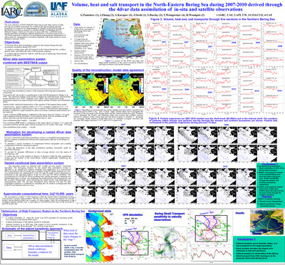 The rich collection of BEST-BSIERP observations and other sources of data provide an excellent opportunity for synthesis through modeling and data assimilation to improve our understanding of changes in physical forcings of the Bering ecosystem in response to climate change. Assimilating data of different origins, which may be sparse in space and time, is difficult using simple algorithms (traditional optimal interpolation, correlation analysis etc.). The 4Dvar approach is effective for performing spatiotemporal interpolation of sparse data via interpolation (covariance) functions with scales based on ocean dynamics (Bennett, 2002).