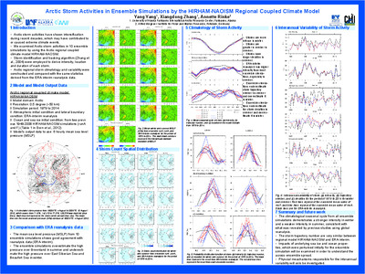 Arctic storm activities have shown intensification during recent decades, which may have contributed to or caused extreme climate events. We examined Arctic storm activities in 10 ensemble simulations by using the Arctic regional coupled climate model HIRHAM-NAOSIM. Storm identification and tracking algorithm (Zhanget al., 2004) were employed to derive intensity, location and duration of each storm. Arctic regional storm climatology and variability were constructed and compared with the same statistics derived from the ERA-interim reanalysis data.
