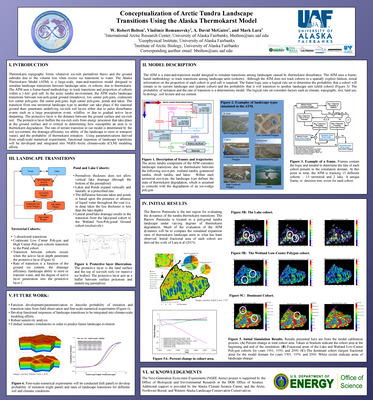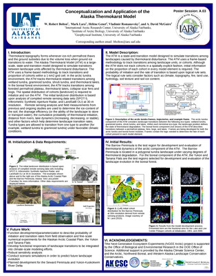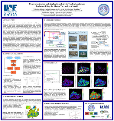 Thermokarst topography forms whenever ice-rich permafrost thaws and the ground subsides due to the volume loss when ground ice transitions to water. The Alaska Thermokarst Model (ATM) is a large- scale, state-and-transition model designed to simulate transitions between landscape units affected by thermokarst disturbance. The ATM uses a frame-based methodology to track transitions and proportion of cohorts within a 1-km2 grid cell. In the arctic tundra environment, the ATM tracks thermokarst-related transitions among wetland tundra, graminoid tundra, shrub tundra, and thermokarst lakes. In the boreal forest environment, the ATM tracks transitions among forested permafrost plateau, thermokarst lakes, collapse scar fens and bogs. The spatial distribution of cohorts [landcover] is required to initialize and run the ATM. The initial landcover distribution is based upon analysis of compiled remote sensing data sets (SPOT-5, Inferometric Synthetic Aperture Radar, and LandSat8 OLI) at 30-m resolution. Remote sensing analysis and field measurements from previous and ongoing studies are used to determine the ice-content of the soil, the drainage efficiency (or the ability of the landscape to store or transport water), the cumulative probability of thermokarst initiation, distance from rivers, lake dynamics (increasing, decreasing, or stable), and other factors which help determine landscape transition rates. Tundra types are allowed to transition from one type to another (for example, wetland tundra to graminoid tundra) under favorable climatic conditions.