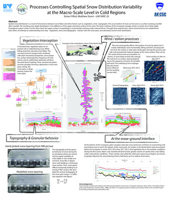 Spatial snow distribution is a result of interactions between snow flakes and other factors such as vegetation, wind , topography. The accumulation of snow can be seen as a surface evolving snowfall after snowfall. The resulting snow depth distribution is the difference of the upper and lower surface of the snow. The lower interface of the snowpack changes winter to winter, but is fairly stable throughout a given winter. On the other hand, the upper surface’s morphology is incrementally evolving under external forces. Through three experiments, where external forces are isolated from each other, we attempt at understanding how they - vegetation, wind, and topography - interact with the snow pack, and ultimately control snow distribution.
