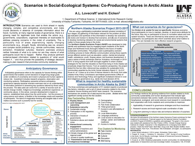 Scenarios are used to think ahead in rapidly changing, complex, and competitive environments, and make crucial decisions in absence of complete information about the future. Currently, at many regional scales of governance, there is a growing need for legitimate tools that enable the actors (e.g., governments, corporations, organized interests) at local-scales to address pressing concerns in the midst of uncertainty. This is particularly true of areas experiencing rapidly changing environments (e.g., drought, floods, diminishing sea ice, erosion) and complex social problems (e.g., remote communities, resource extraction, threatened cultures). Scenario exercises produce neither forecasts of what is to come nor are they visions of what participants would like to happen. Rather, they produce pertinent evidence-based information related to questions of “what would happen if...” and thus provide the possibility of strategic decision- making to plan research that promotes community resilience.