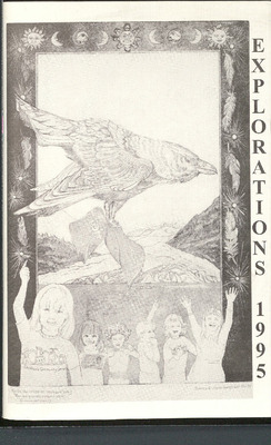 Explorations ’95 is published with support from the University of Alaska Southeast School of Education, Liberal Arts, and Science, the Chancellor’s Office, and contributor reader/entry fees. Works do not necessarily reflect the views of the University. Editor: Art Petersen; Asst. Student Editor: Cecilia Watson. Submissions (910) were “blind juried” by Nancy Lord, Art Petersen, Ron Silva, Leslie Williams, and Bob Mayberry—poets, writers, and faculty in literature. Nancy Lord awarded first place prizes of $500 each (and 2nd and 3rd places) for poetry and short fiction. Art Editor Alice Tersteeg and students awarded $175 in prizes for art.