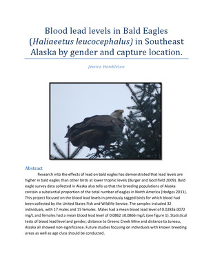 Research into the effects of lead on bald eagles has demonstrated that lead levels are higher in bald eagles than other birds at lower trophic levels (Burger and Gochfield 2009). Bald eagle survey data collected in Alaska also tells us that the breeding populations of Alaska contain a substantial proportion of the total number of eagles in North America (Hodges 2011). This project focused on the blood lead levels in previously tagged birds for which blood had been collected by the United States Fish and Wildlife Service. The samples included 32 individuals, with 17 males and 15 females. Males had a mean blood lead level of 0.0283±.0072 mg/L and females had a mean blood lead level of 0.0862 ±0.0866 mg/L (see figure 1). Statistical tests of blood lead level and gender, distance to Greens Creek Mine and distance to Juneau, Alaska all showed non-significance. Future studies focusing on individuals with known breeding areas as well as age class should be conducted.