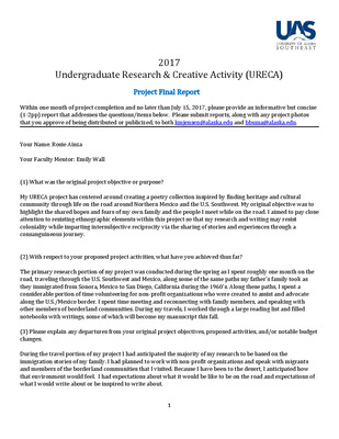 My URECA project has centered around creating a poetry collection inspired by finding heritage and cultural community through life on the road around Northern Mexico and the U.S. Southwest. My original objective was to highlight the shared hopes and fears of my own family and the people I meet while on the road. I aimed to pay close attention to resisting ethnographic elements within this project so that my research and writing may resist coloniality while imparting intersubjective reciprocity via the sharing of stories and experiences through a consanguineous journey.