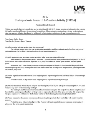 The original project objective was to determine a suitable model organism to study Pandalus platyceros. I proposed to use the local dock shrimp Pandalus danae to do this research. This project allowed me to further my research on the study of Pandalid shrimps. I have been working with a very large species of shrimp for 3 years and getting experience working with a small shrimp species has greatly influenced my strengths in dissection methods. I feel confident I could isolate almost any tissue in any shrimp species given the correct tools, something I was skeptical about before this project. This project will give my mentor and I the opportunity to publish another gene sequence and further the knowledge of the genus Pandalus. In the future I could use this knowledge to sequence androgenic gland genes in other Pandalus species, potentially becoming part of a master’s project.