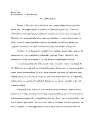 The goal of this project was to identify the most common killer whale ecotype in the Juneau area. Over 400 photographs of killer whales taken from the years 2012-2015 were collected from Juneau photographers and marine naturalists on various whale watching boats. The photos were analyzed and the killer whales were identified as either resident, transient, or offshore based on morphological characteristics. Additionally, the individual whales were compared to published killer whale identification catalogs and identified when possible.