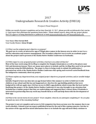My goal was to create an interactive app of Tlingit place names in the Juneau area in order to use it as a tool for education and resource management. The secondary objective was to write an academic paper about the project and to present at the Alaska Native Studies Conference in Fairbanks.