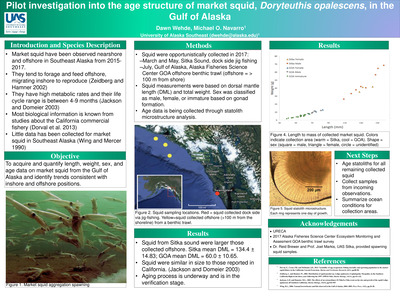 The objective of my URECA funded project was to conduct a pilot investigation that aimed to provide a data set of the age, size, and maturity of market squid, Doryteuthis opalescens, collected in the Gulf of Alaska. The information I collected was used to infer the establishment of a residential or transient population of market squid in the sampled area. I hypothesized that squid collected offshore (> 100m from the shoreline) would be less sexually mature and younger than squid collected inshore which supports the establishment of a residential population. In comparison, no significant differences between size, maturity, and age between squid collected offshore and inshore supports that the squid are from a transient population.