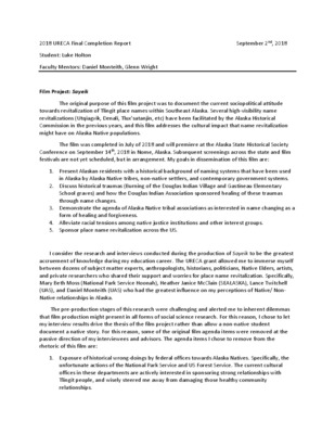 The original purpose of this film project was to document the current sociopolitical attitude towards revitalization of Tlingit place names within Southeast Alaska. Several high-visibility name revitalizations (Utqiagvik, Denali, Tlux’satanjin, etc) have been facilitated by the Alaska Historical Commission in the previous years, and this film addresses the cultural impact that name revitalization might have on Alaska Native populations.